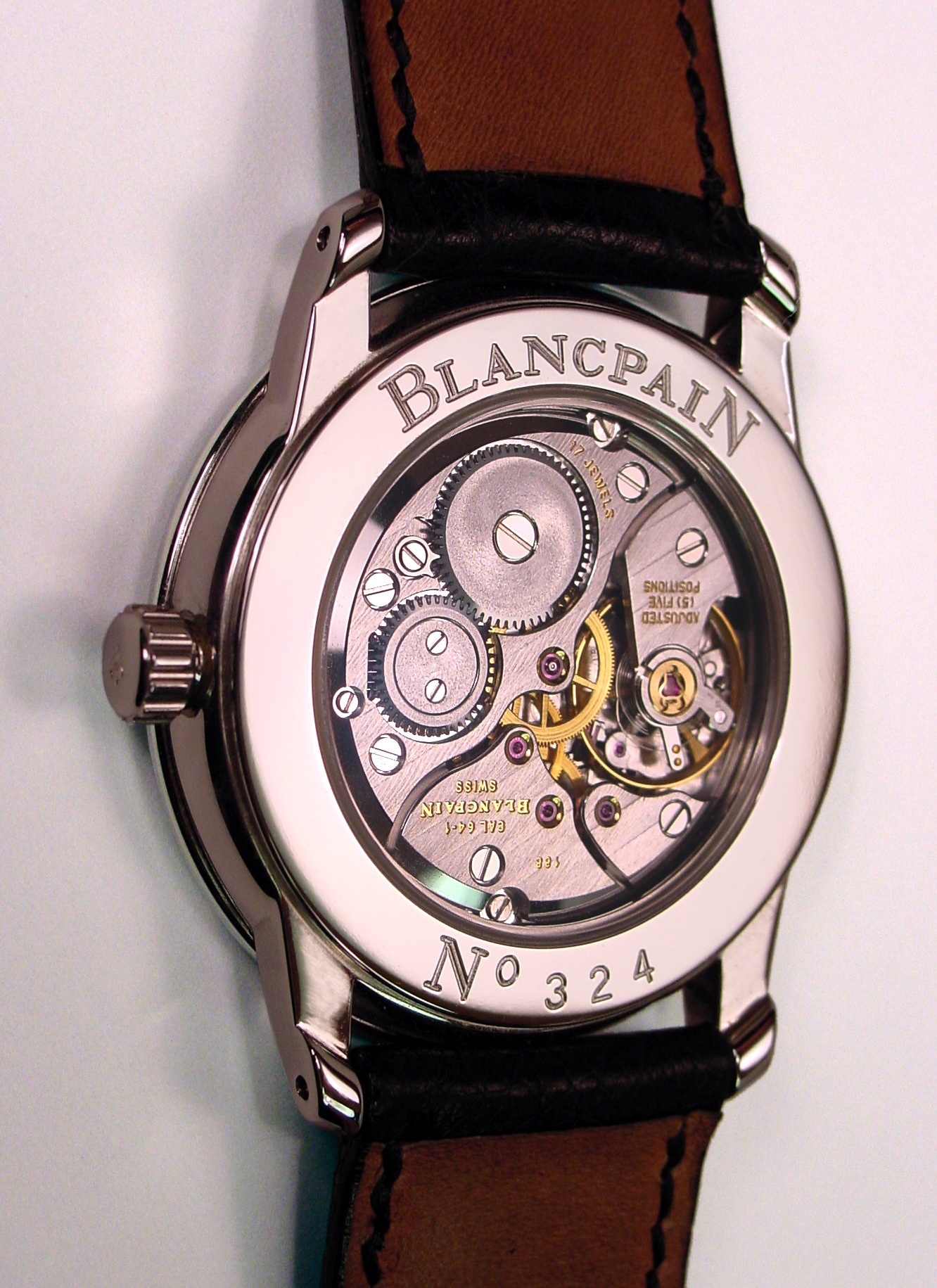 It is therefore my entirely unsupported suspicion that this watch perhaps dates back to the earlier years of BP's re-incarnation, and has been a slow seller ever since. There have evidently been versions with white dial and with a mix of arabics and markers, as well as the present example with black dial and full arabics. The watch has evidently only been produced in stainless steel (odd, to me, for a rather thin and dressy watch) and at least currently has a display back.