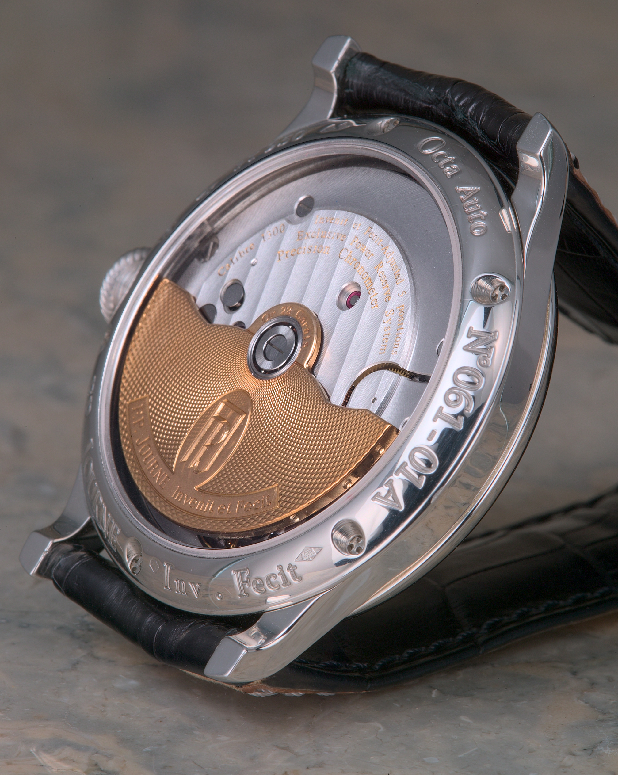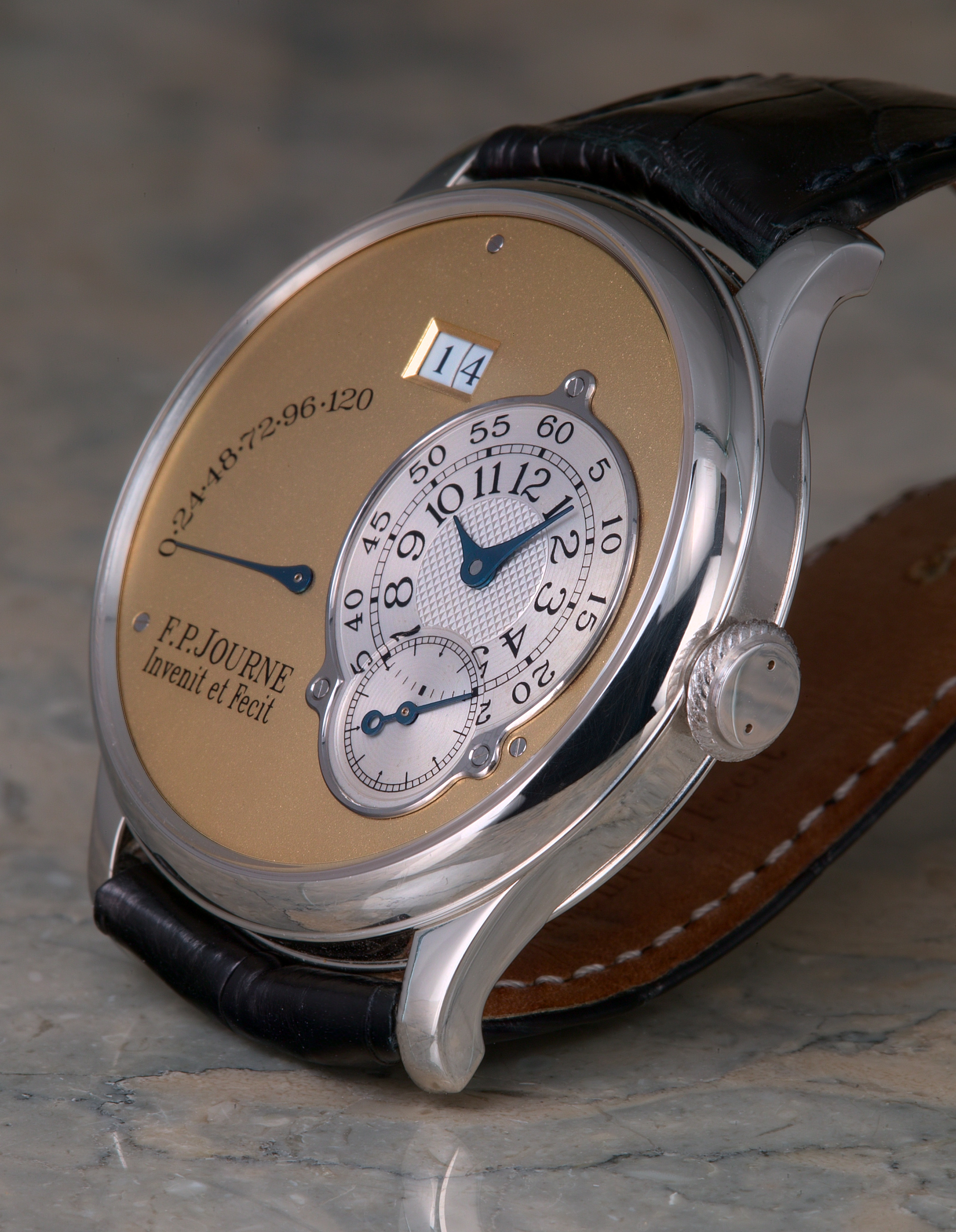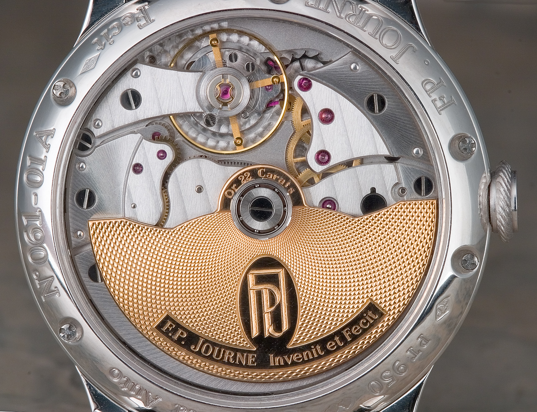"Invenit et Fecit" (invented and made) is how Francois-Paul Journe labels the dial of his watches, indicating his firm's intentionally traditional approach to watchmaking. Journe's background appears to be from the historical mold, as well. Born of a watchmaking family, he spent some 2 decades in what may be considered "professional apprenticeship", producing unique watches upon commission, and restoring historical timekeepers. Some 5 years ago he began designing calibers for already established Swiss brands, and finally in 1999 he opened his own manufacture, F. P. Journe Invenit et Fecit, in Geneva. It is my understanding that all parts of his watches are designed, finished and assembled on site, with some parts being fabricated to specification by contract.