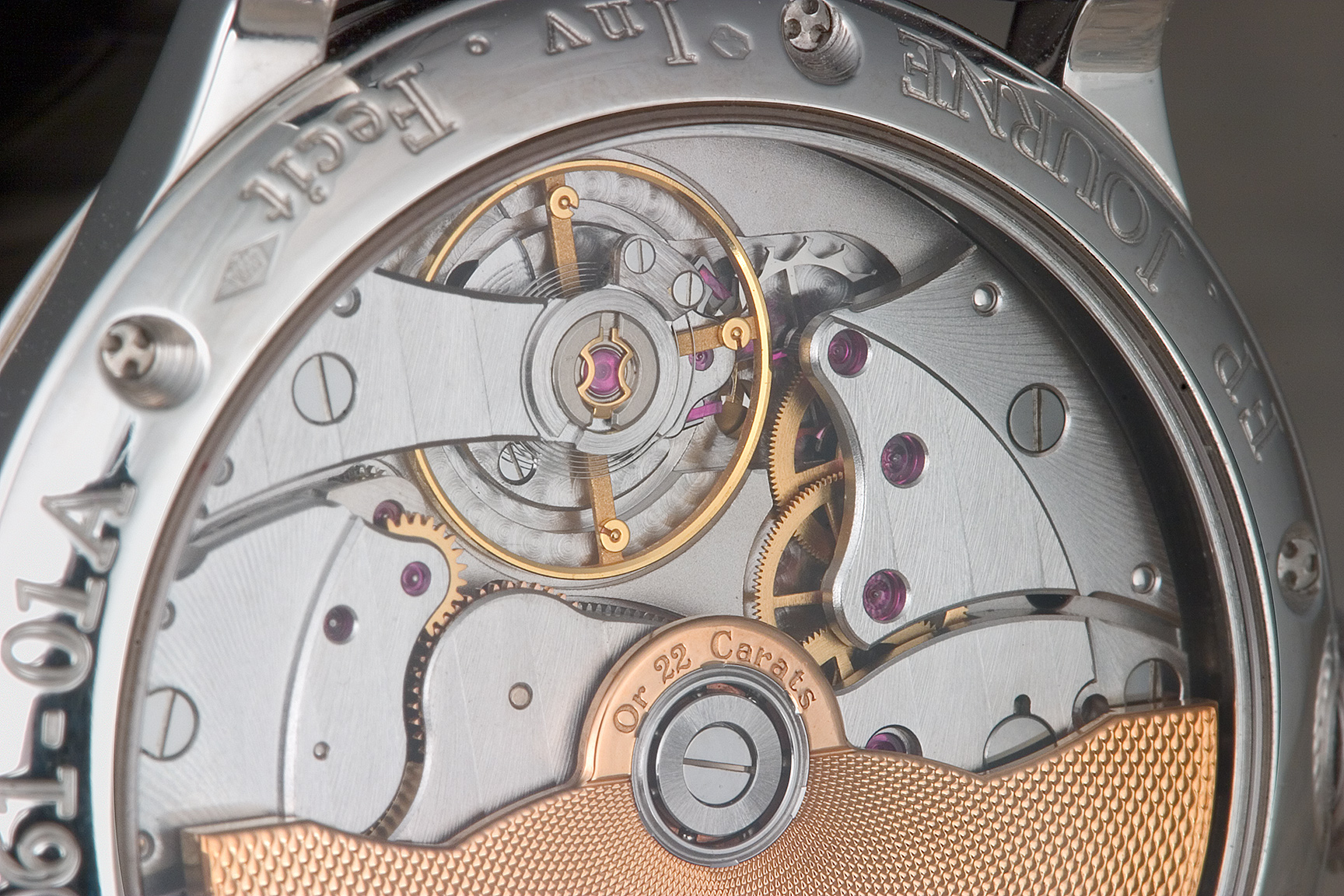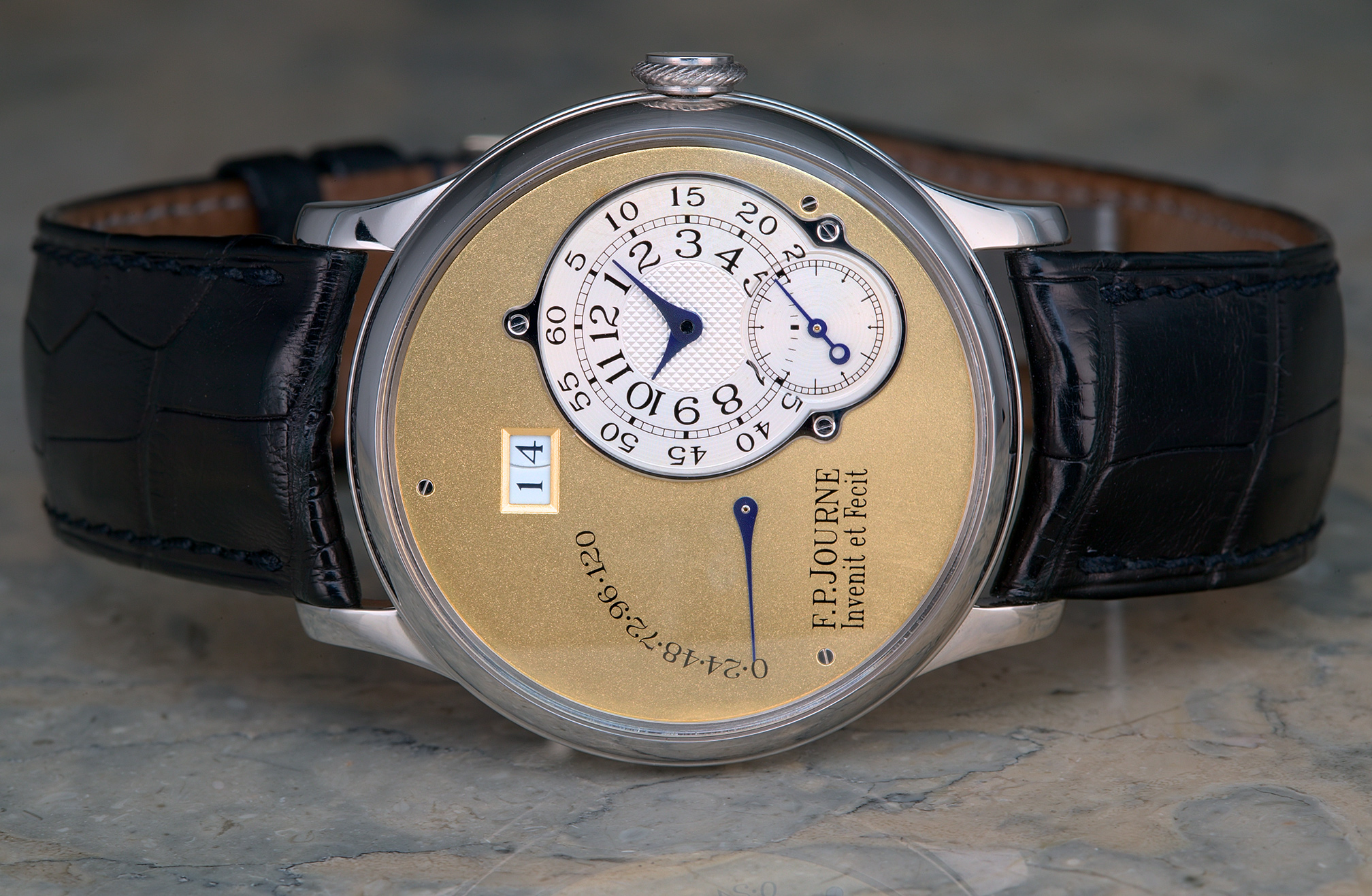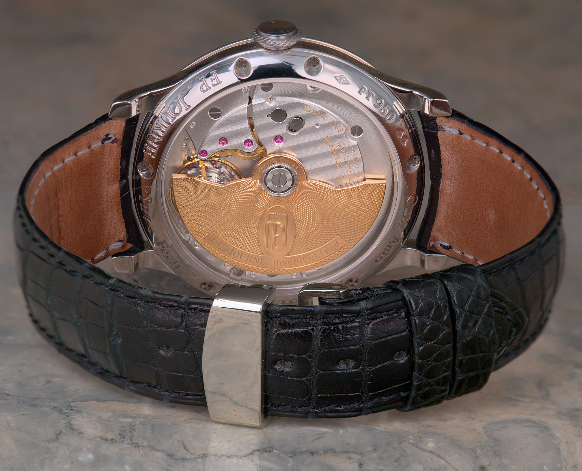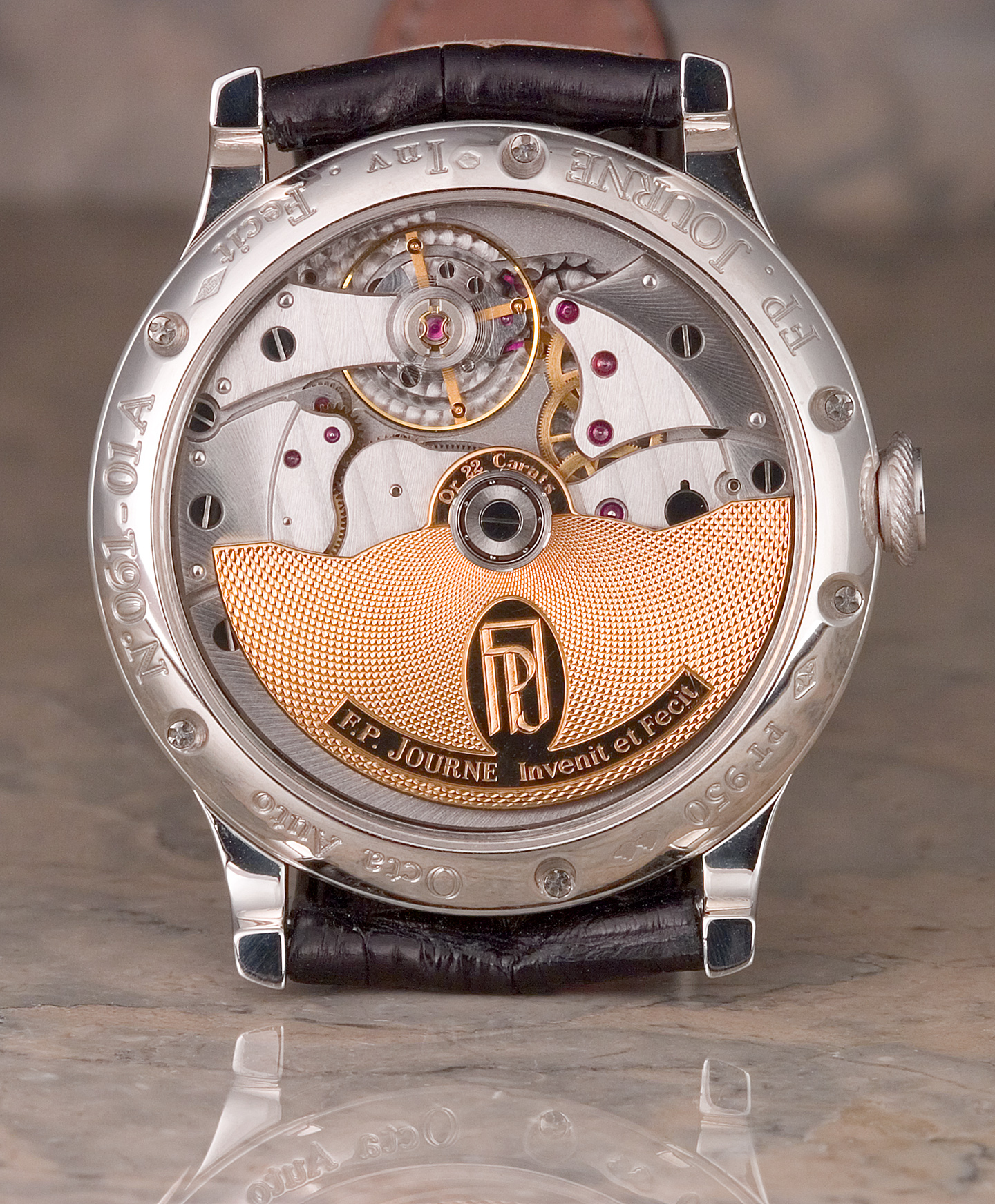"Invenit et Fecit" (invented and made) is how Francois-Paul Journe labels the dial of his watches, indicating his firm's intentionally traditional approach to watchmaking. Journe's background appears to be from the historical mold, as well. Born of a watchmaking family, he spent some 2 decades in what may be considered "professional apprenticeship", producing unique watches upon commission, and restoring historical timekeepers. Some 5 years ago he began designing calibers for already established Swiss brands, and finally in 1999 he opened his own manufacture, F. P. Journe Invenit et Fecit, in Geneva. It is my understanding that all parts of his watches are designed, finished and assembled on site, with some parts being fabricated to specification by contract.