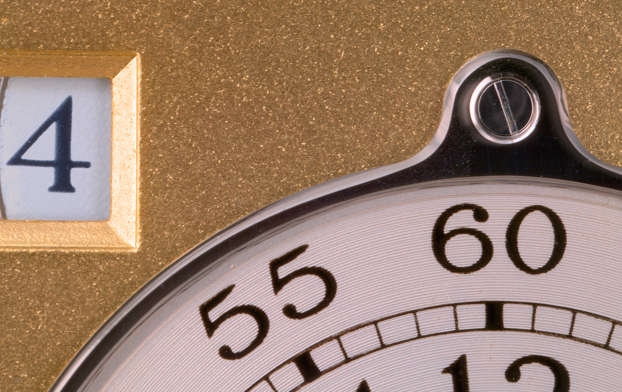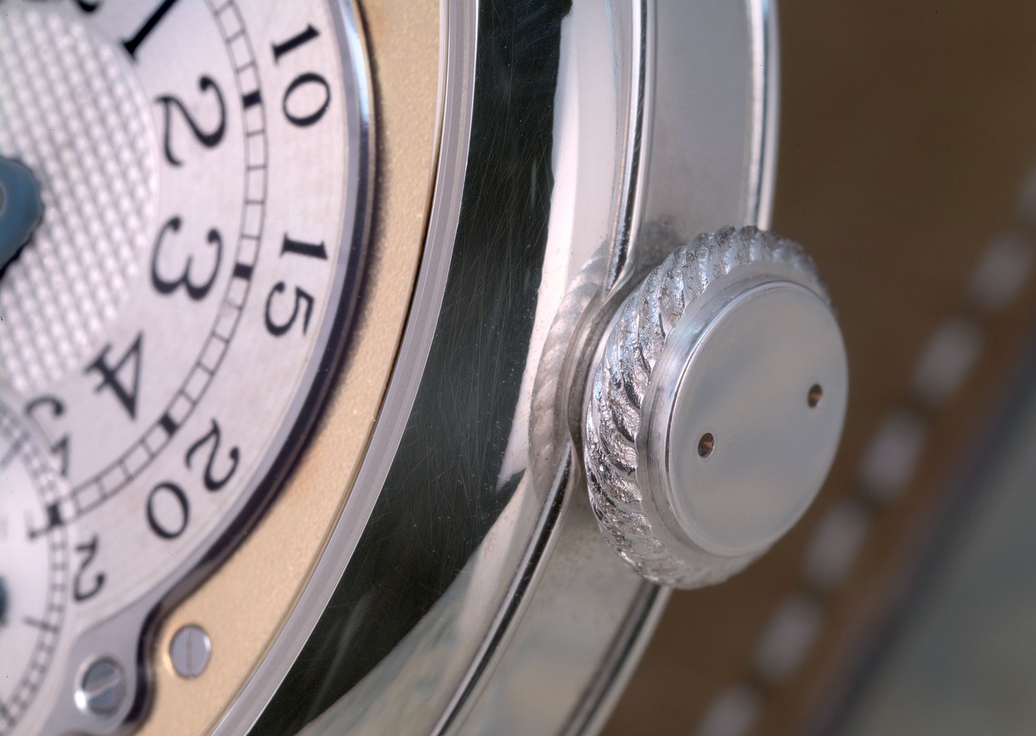 Certainly nobody is going to critizize Journe's bill of materials, a hefty 38.3mm by 10mm platinum case with two sapphire crystals, solid gold dial and 22k gold rotor. The finish of the main dial is perhaps a nod to the way fine chronometer movements used to be finished, being a beautiful frosty matte. The subdials are engraved sterling silver, and that portion which is not guilloched is turned in very fine concentric circles; That the numerals and various markings are so totally crisp and clear testifies to the quality of the printing. The crown provides a unique ropelike knurl for gripping, and sports a pair of small holes for pondering.