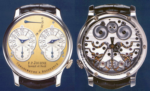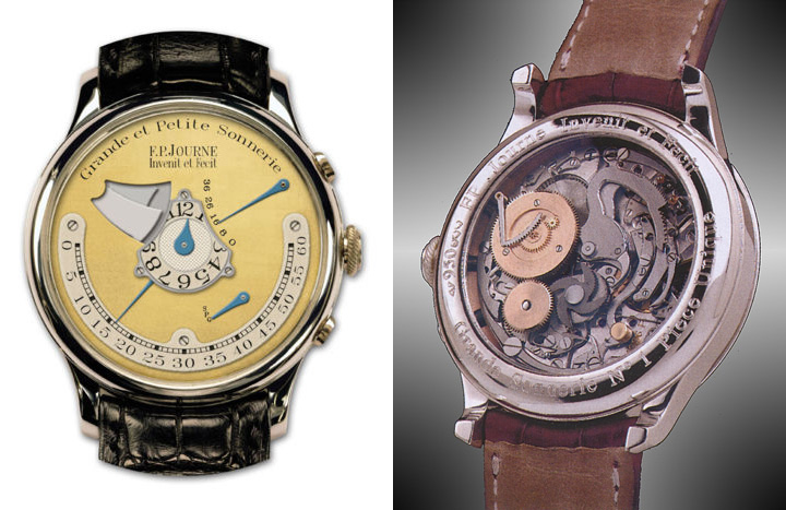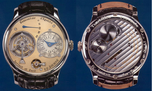 His first three designs have been produced in from unique to miniscule quantities, and seem intended to establish the distinctive quality of his insight into traditional watchmaking, and his ability to realize his vision in actual, functioning wristwatches. These are exceptionally complex productions, and each pairs a timekeeping approach unique (I believe) in wristwatches with a traditional complication. I shall try to briefly describe them, and please excuse my ignorance of the technical details of these movements, as well as my being unable to attribute their pictures, all of which were gathered from promotional sites, and presumably originate at the Journe firm.
