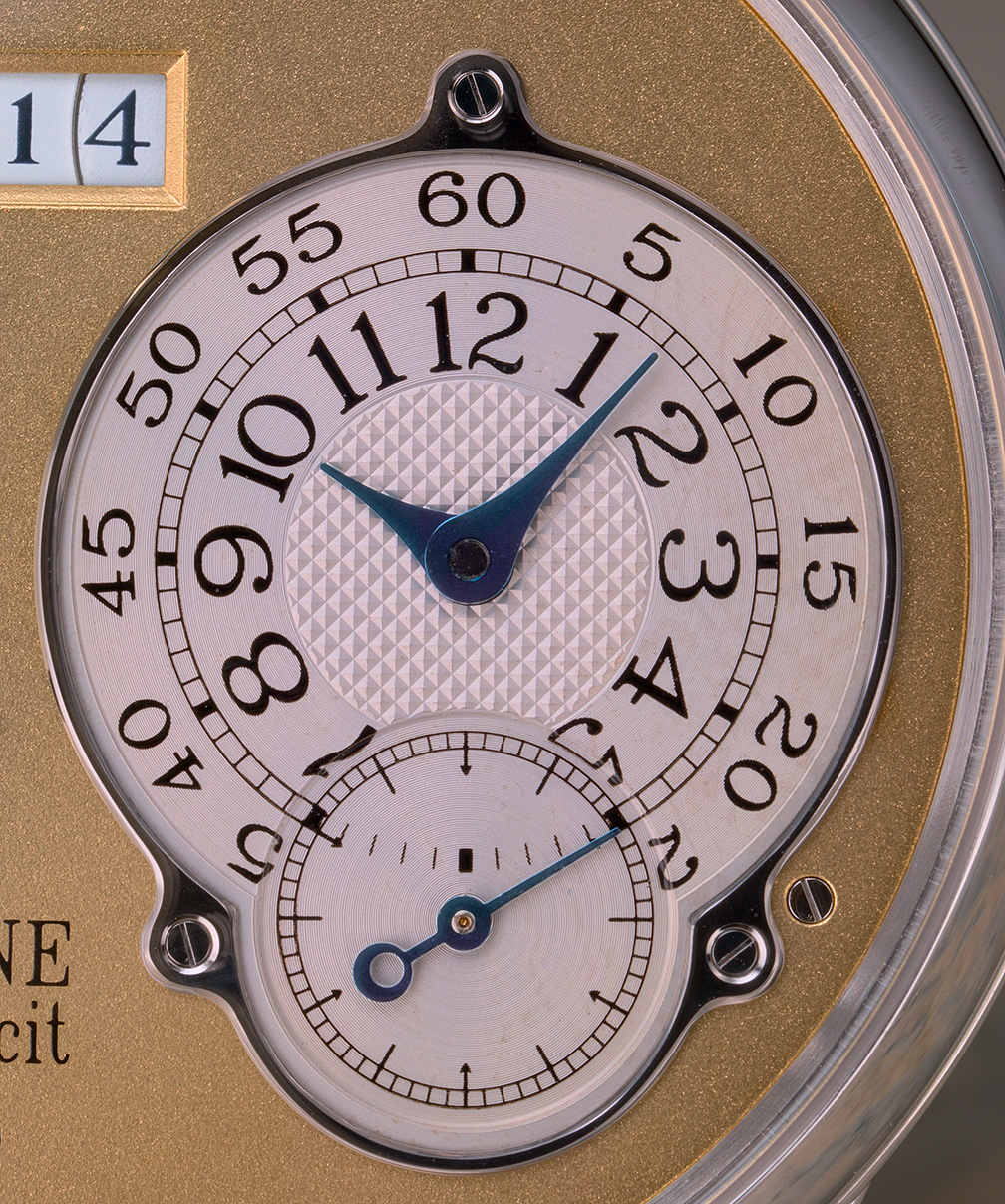 Before I had a chance to examine and live with this watch, I might have kindly described the dial as "functionally mechanistic". In pictures the exposed slotted screws and the manner in which the subdials are mounted seemed a bit amateurish, the layout a knockoff of the Lange 1, and the numerals are as tall as the hour hand is long. Indeed, those hands, described as "exclusive"; well. why not! The truth is, the design is a bit mechanistic, but this is not necessarily unattractive. It is functional, the date and power reserve are (obviously) well-provided, and I have found that somehow, the compact time-telling arrangement is exceptionally readable, even while glancing with aging eyes.