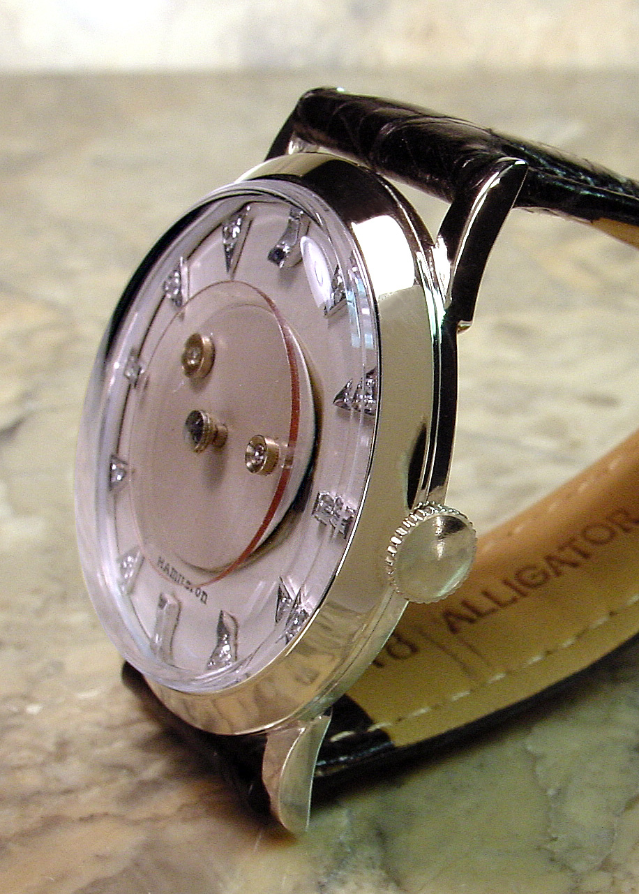 This watch is the first vintage watch I purchased, in early 2000, and I ended up with a beautiful and interesting watch despite my ignorance. I spotted it while looking through the stock of a popular vintage etailer, and having learned that older Hamilton watches were well-respected, and charmed by the "mystery dial", I took the plunge. Besides, I figured that a platinum watch with diamonds on the dial for not much more than the cost of many an ordinary steel watch couldn't be too bad of a deal.