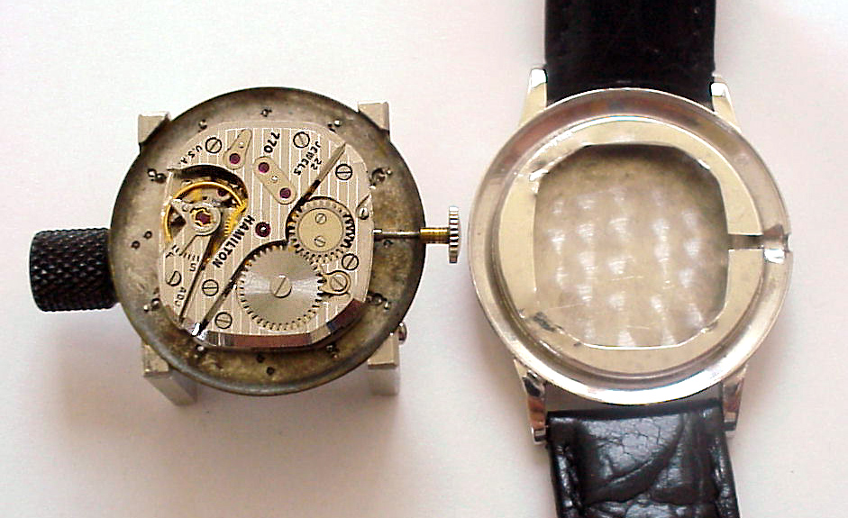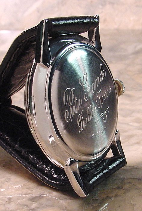 I have sent my pictures to Rene Rondeau, author of the authoratiative books on Hamilton wristwatches, and he most considerately informed me that not only was the case a custom job, but that he strongly felt the dial was also, and not the work of Hamilton watches. That is, there is (and probably was) no "original dial" for this watch, and I had no reason to hesitate in refinishing an older, worn dial in the first place!