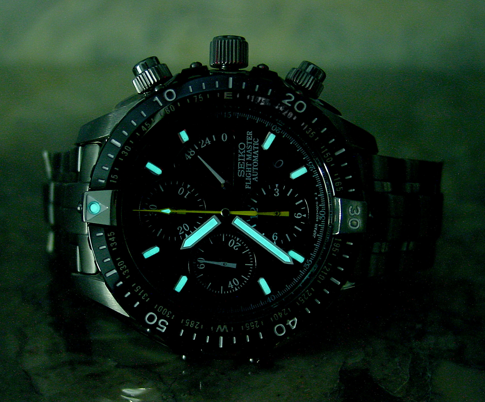 The present Flightmaster is part of Seiko's high-end "Prospex" line, and it is quite a piece of work. Glossy black-dialed, with exceptionally luminous hands and markers and sporting a bidirectional timing/compass bezel and a dive-watch case and profile, this chronograph seems to be some sort of crossover watch. The crown screws down and the chronograph buttons lock, but it also has a display back. Besides the primary time indications, the Flightmaster includes the date at 4:30 (with a dial-matching wheel), power reserve at about 2:15, and elapsed time counters for seconds, minutes (30) and hours (12), all with bright yellow hands; the seconds-hand also has a luminous spot. The case is of modern sports-watch proportions, 43mm diameter exclusive of crown, and about 13mm thick. The secure squeeze- and flip-lock bracelet is durable and handsome, and the rotating bezel is anodized a shiny black. All of this is apparently titanium (except probably the crowns) and carries an excellent finish, mixing brushed and polished surfaces. There are also these weird little screws on the bezel (sort of functional) and on the case between the crown and pushers, and also opposite (sort of decorative, presumably); there is a lot going on here, somewhat in the Japanese idiom, but since almost all of it is black, gray or white the whole thing seems to hang together and truly presents a readable and functional package.