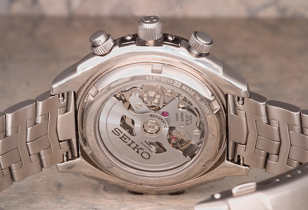 In the world of watches the design and production of a proprietary chronograph is a relatively unusual and ambitious achievement, and in this respect the Flightmaster certainly does not disappoint. Seiko competed 35 years ago in introducing (one of) the first automatic chronograph movements (caliber 6139, in 1969), and a splendid one it was, a clean-sheet design, integrated column-wheel control and sufficiently durable that many, many of them are still around and functioning very well; they weren't (and aren't) even expensive). The Flightmaster's movement is of the same temperment but distinctly more sophisticated, and yes, more expensive. On a personal level I would note that the chronograph functions work very pleasantly and smoothly, the buttons providing a nice combination of soft responsiveness and positive feedback, engaging with a slight click, and the minute and hour counters do their jobs neatly and right on cue. Pulling the crown all the way out stops the movement for exact setting. You can read a far more detailed analysis of the Flightmaster's 6S37 movement, as written by genuine watchmaker 2manywatches, at this link here.