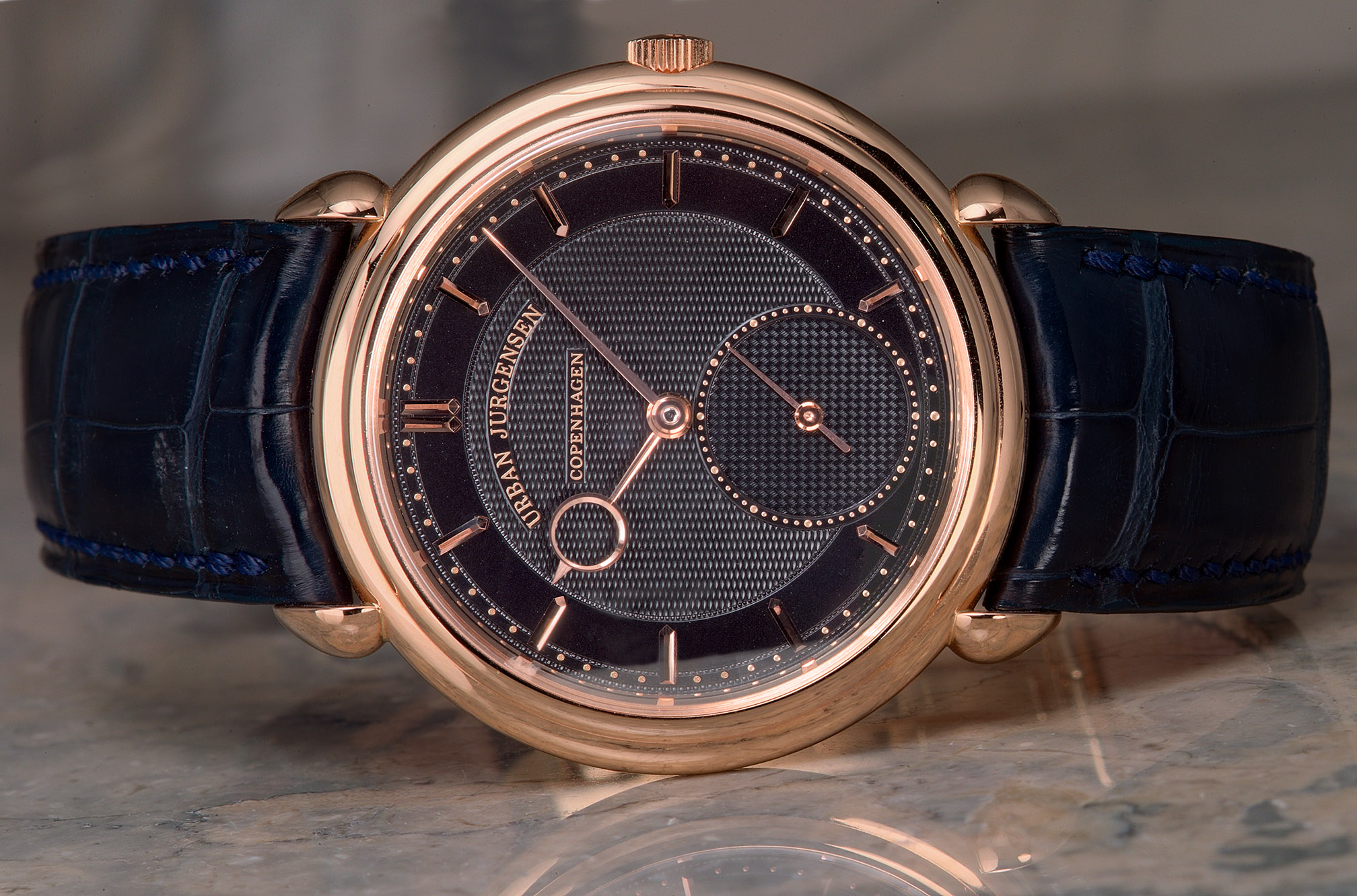 Although the makers of the present watch have adopted the name of a historical watchmaker, the current Urban Jurgensen brand is not really a resurrection of a defunct brand (as are, for example, Blancpain, Lange and many others), rather its reference is to an esteemed individual Danish horologer and author of this name, and of some over two centuries ago. The current company is perhaps a decade old, and while the watches may be Danish, the base movements are Swiss. Much like the new brand DeBethune, UJ seems to be in the vanguard of re-inventing the modern mechanical dress watch, and the result is a gracious blending of historical elements and modern materials and proportions. The UJ Reference 8 is 38mm diameter, exclusive of crown, and about 6.5mm thick: