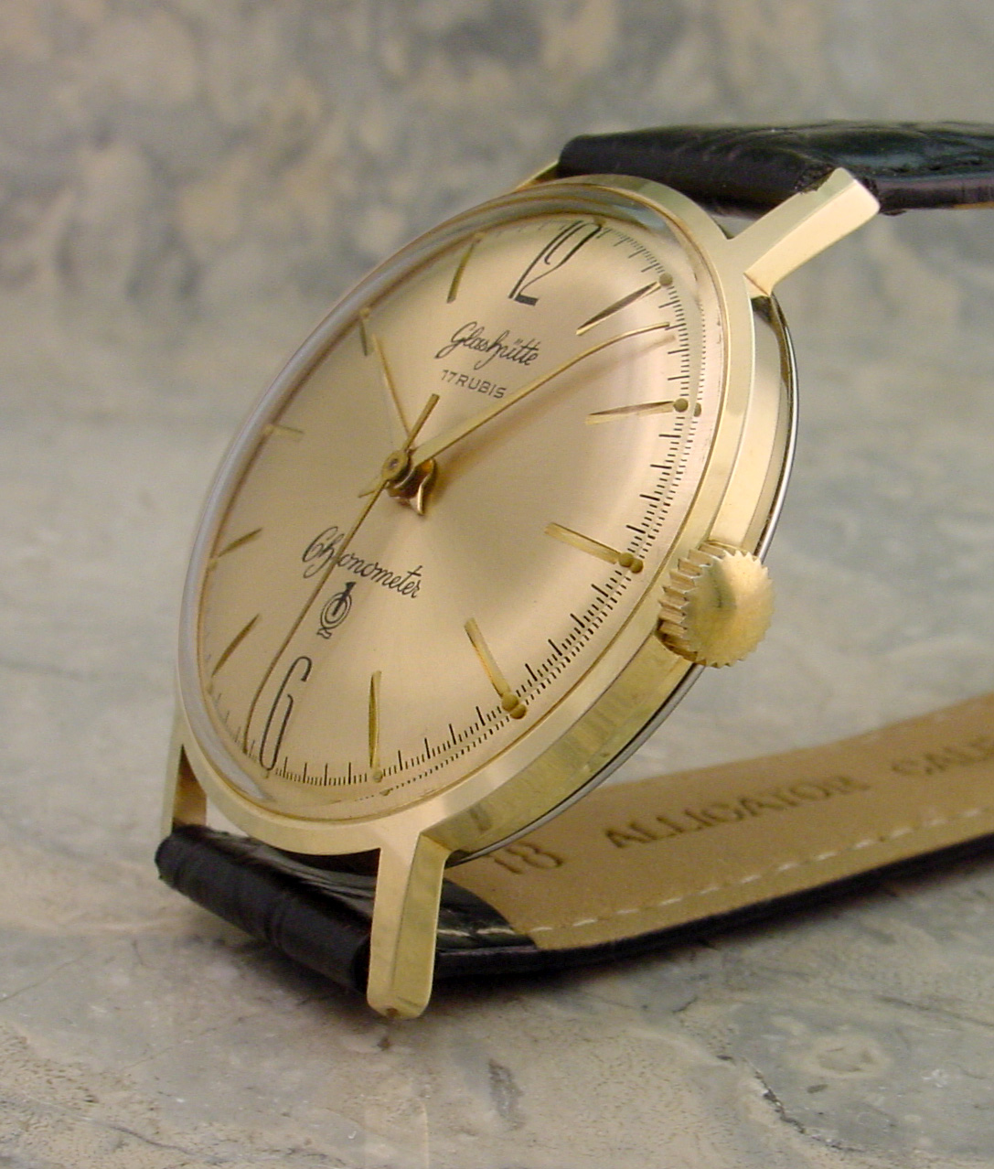 This watch is 36mm diameter, exclusive of crown, and plated with 14k gold, except for the original back, which is steel. The movement is 12 1/2 lignes (about 28mm) diameter and incorporates proprietary shockproofing. Despite its questionable credentials as a "fine watch", the GUB is actually rather handsome, its simple, one-piece case is nicely sculpted, and the gold sunburst dial with applied markers is attractive and legible, if stylistically dated even considering its actual age.