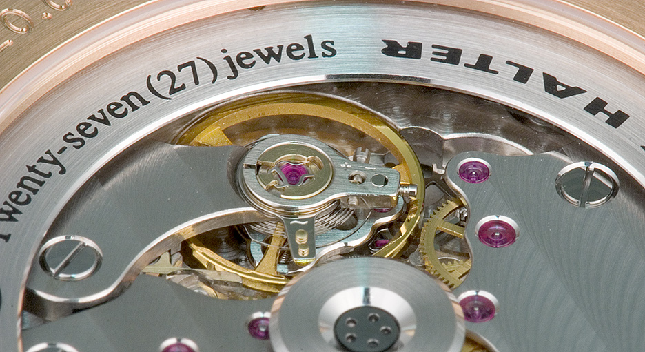 While the mechanics of this watch are not intended as a great horologic adventure, Halter uses the unusual and very highly regarded Lemania 8810 movement, adding some jewels and reshaping the bridges in a soft, organic manner. The striping is quite distinctive, wide, and alternating lighter and heavier sections in a precise pattern. The attention to detail and finish is in my opinion first rate, not a bit below any competition at this price point, and just as impressive as the rest of the watch. The sapphire rotor is of course a highlight, allowing automatic winding without obscuring one's view of the beautiful movement below, and spinning delightfully before finally setting to rest with its legends always properly oriented.