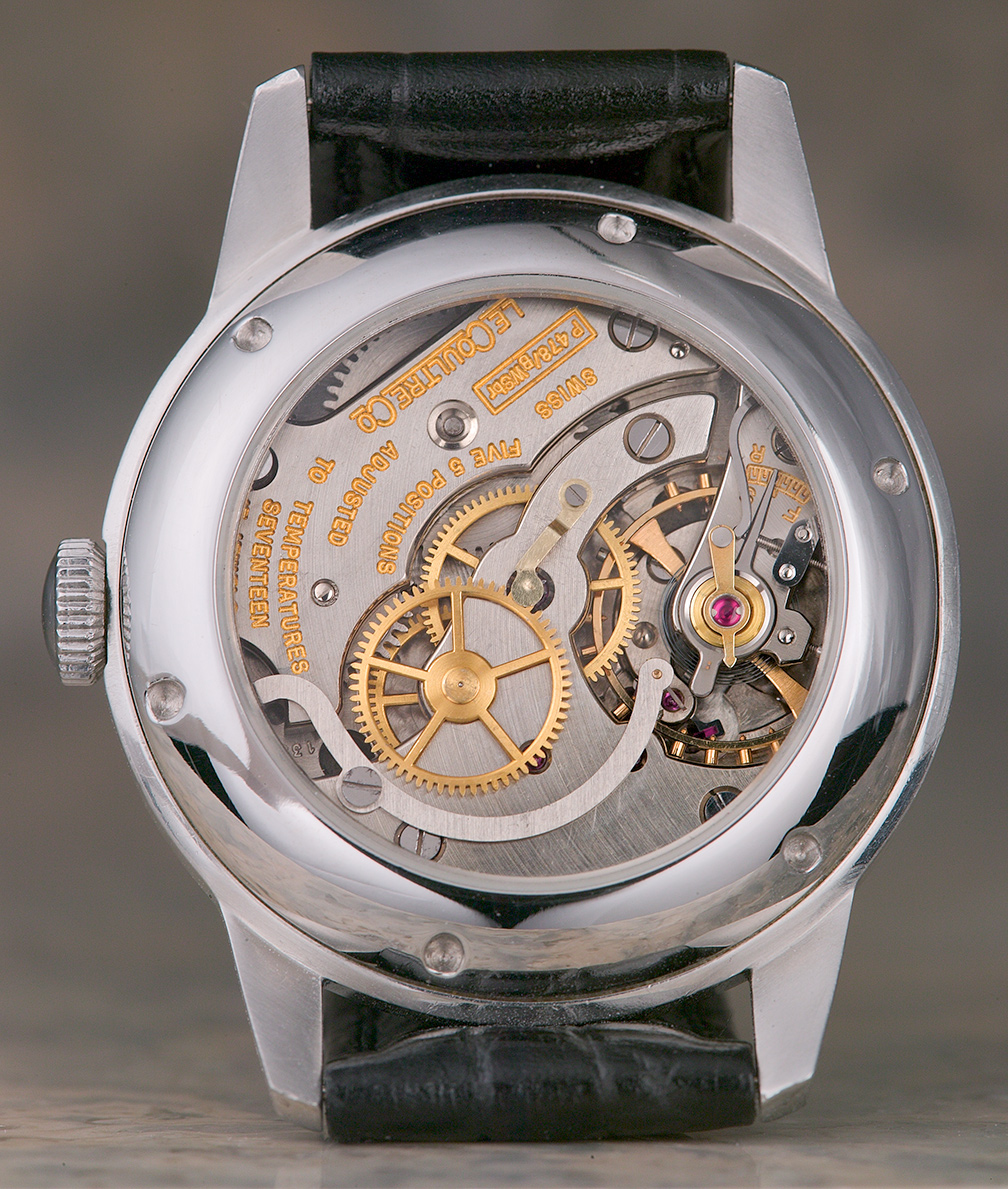 The real highlight here is the movement, designated 478/BWS/br. While I am still researching the full meaning of this nomenclature, I believe this indicates the version of caliber 478 with fine regulation, stop-seconds (when the crown is pulled), 4 adjusting screws in the balance and a Breguet overcoil hairspring. It is apparently the most highly realized version of a series of 12 1/2 ligne (about 28mm diameter) JLC movements stretching back to about 1940, and has been fully adjusted. There is nothing particularly decorative about its finishing, but a close inspection reveals the attention lavished upon the details in pursuit of accurate and consistent running. For example, note the carefully beveled rim and arms of the gears, and of the balance wheel. The jewels and pallet stone are exceptionally clear, and the edges of the gear teeth and of the bridges are free of any burrs or excess metal.