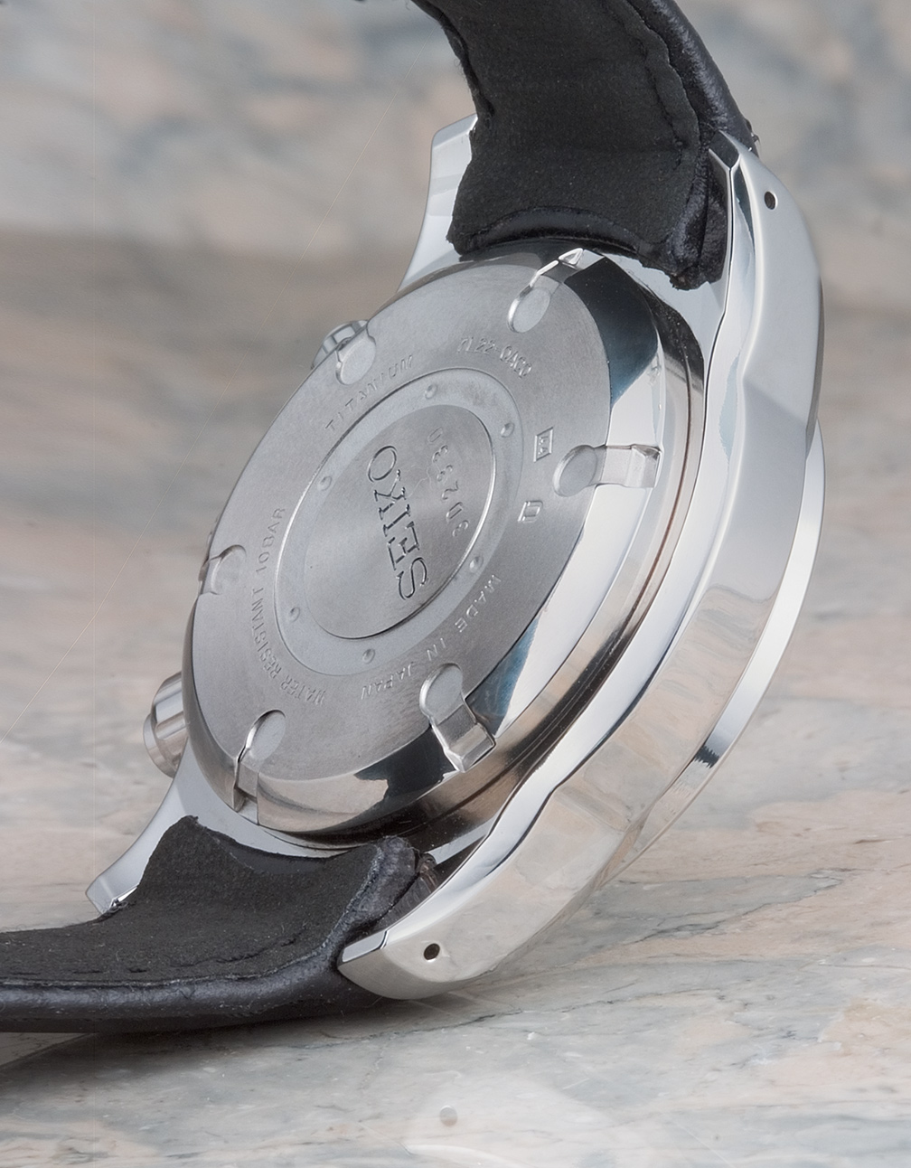 Right up front, it must be admitted that Seiko's kinetic chronograph movement, their 7L22, is no beauty. It is not without interest, however, certainly the dial layout it allows is distinctive, and it displays elapsed time in 1/5-second intervals (just like an 18kbph mechaincal movement) and the minute-counter stops at 45 and flies back when reset. When fully charged the capacitor will supposedly power the watch for 5 months, and will warn of low power reserve by clicking the constant seconds at every other second, rather than each second. Naturally it keeps very consistent time, and the chrono functions perfectly and the buttons are surprisingly pleasant, the starting push being just slightly stiff, while stopping and resetting are soft but certain, almost elegant in their feel. Still, as I mentioned it is nothing much to look at (sorry, I don't currently know the source of this picture):