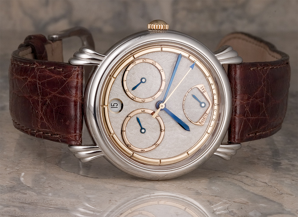 The current watch is his Transworld model. It is dress-size (35mm diameter and 9.5mm thick), and of the traveller or 2-time-zone type. "Home time" is displayed by the dials at 10 o'clock (24-hour style) and at 2 o'clock (minutes), and the date at top. The large hands would display local time, and power reserve is shown at the bottom. The setting mechainsm is most interesting; the crown has 2 detents, and pulling it all the way outward sets all 5 indicators in motion (2 hour-hands, 2 minute-hands, and the date wheel). Positioning the crown at the intermediary detent will quick-set the date by turning counterclockwise, and set just the 2 large hands by turning clockwise. By this arrangement one can simply reset the large hands when traveling with no concern whatsoever that the "home time" display will suffer, and it also accomodates the possibiltiy of uneven time zones since the two displays need not be synchronized on the hour! (All the above images are from Vincent Calabrese's website and other commercial sources)