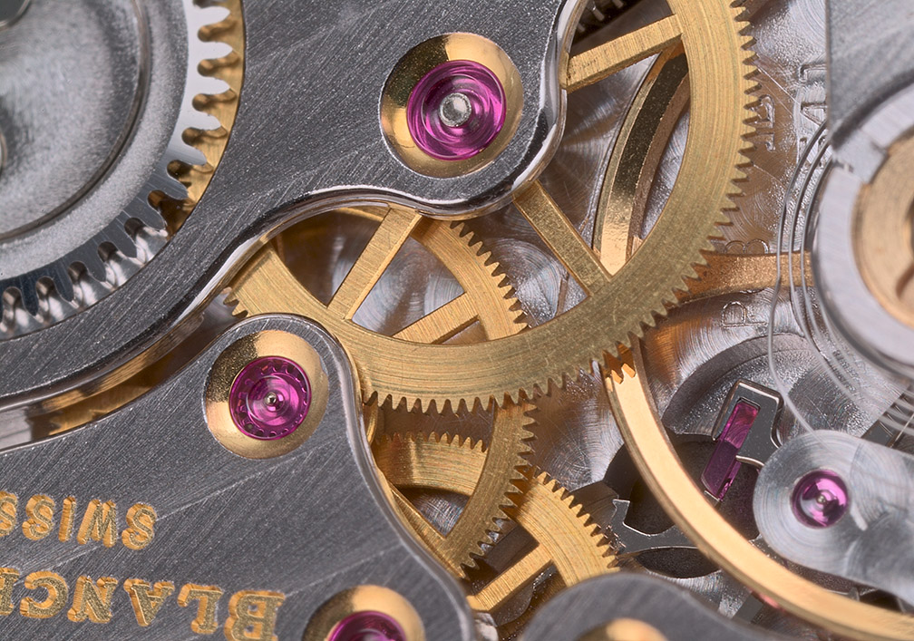 Even though the 7002 is probably the least expensive watch ever produced by the modern Blancpain, they have invested considerable effort into the movement. In this iteration, the bridges are sensuously curved, and the emphasis is on fine traditional finish, including bold Geneva stripes and black-polished and beveled screwheads. As engraved, he 64-1 is fully adjusted for positions: