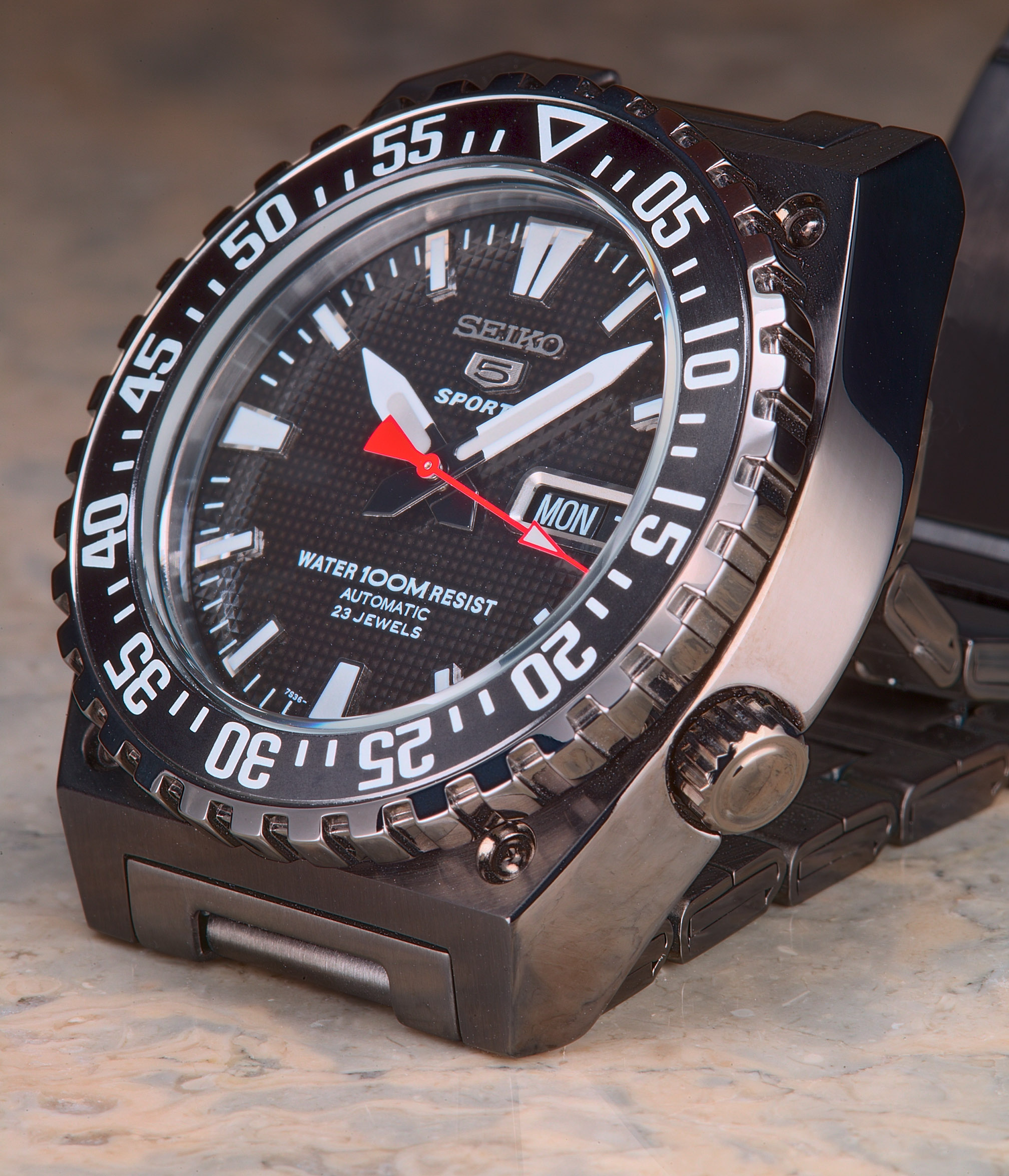Both watches have very nice ratcheted one-way bezels (without a luminous dot), elegant waffle dials with luminous inserts for the hands and hour markers, crisp, brushed and polished sculptured cases (somewhat similar to Seiko's larger Samurai divers) with semi-recessed, non-screwdown crown and virtually superfluous display back, and matching folded-link bracelets. The black-dial version has black & white (and red seconds) hands and a blackened case and bracelet, while the silver-dial watch sports black & polished hands and plain steel case and bracelet. As might be expected from Seiko at this price point, the overall finish is factory-style, rather than elegant-boutique, but still offers exceptional value.