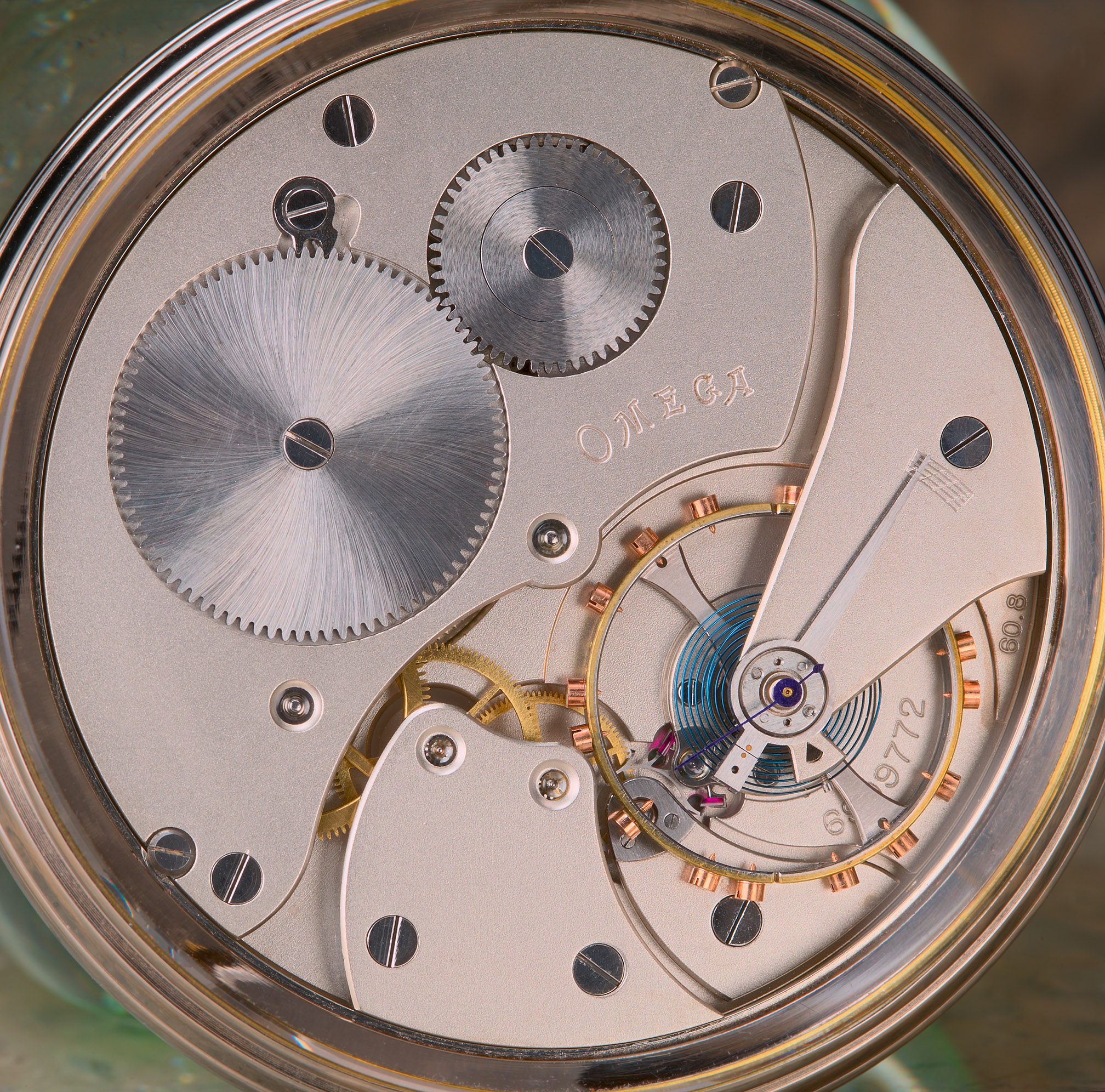 Aesthetically, this movement is the antithesis of decorative design. Geneva stripes, bright red sapphires, gold chatons, blued screws and pigmented engraving are all absent. Instead there is only the serenity of plain frosted German silver bridges, polished screwheads, and clear jewels neatly countersunk, each offering a glimpse of the shaft and gears below: