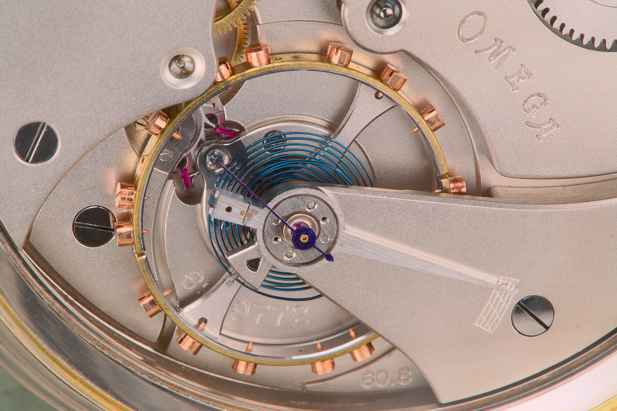 This view shows the blued-steel overcoil hairspring and Guillaume alloy balance with gold adjusting screws. The balance can be distinguished from a normal split, bimetallic balance by the relatively long 'tail' between each arm and cut rim. While an ordinary bimetallic balance will help compensate for timing errors at high and low temperatures, a Guillaume balance does so with much less distortion at ambient temperatures: