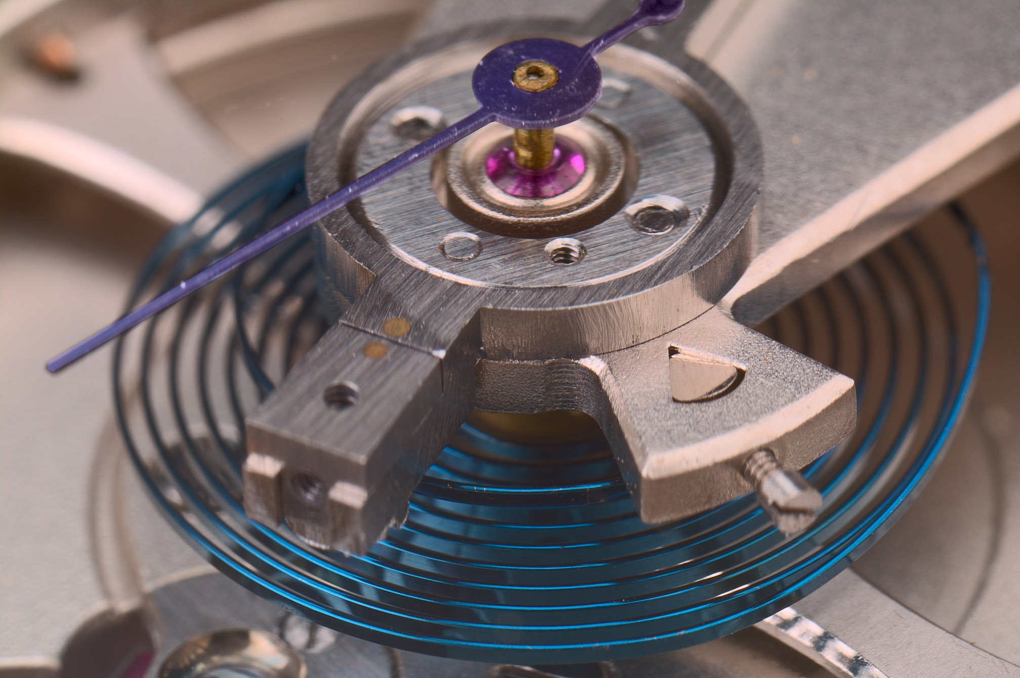 Stud carrier (right) and the business end of the regulator (left), along with a closeup of that ultra-blue spring. The purple hand attached to the end of the balance staff can be used to judge the amplitude as it swings back and forth, and hides a single colored sapphire: