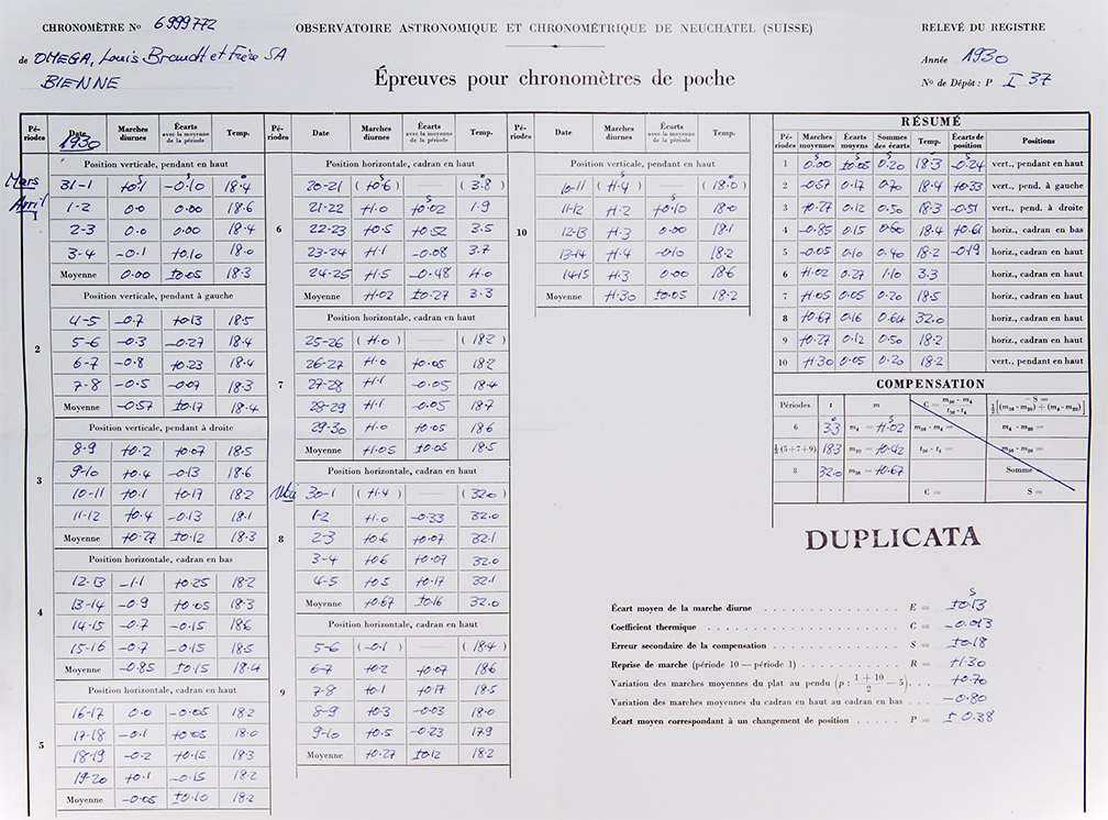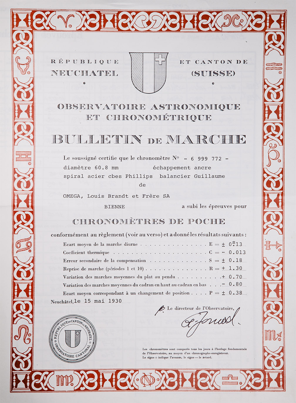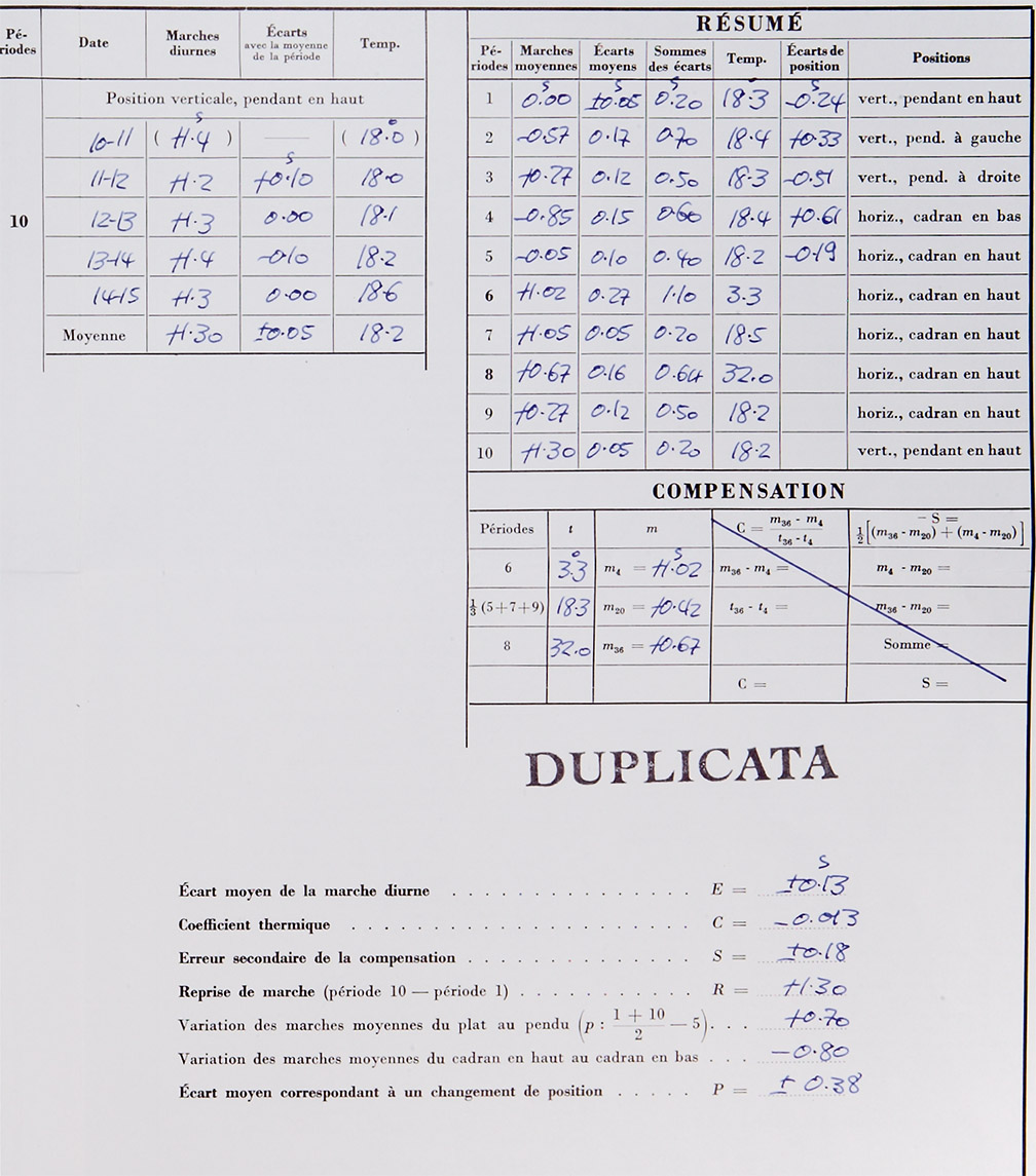 The front page of the Chronometre certificate describes the movement by serial number, diameter, balance and escapement details, and manufacture, and provides this summary of performance:Average daily rate: +/- 0.13 seconds