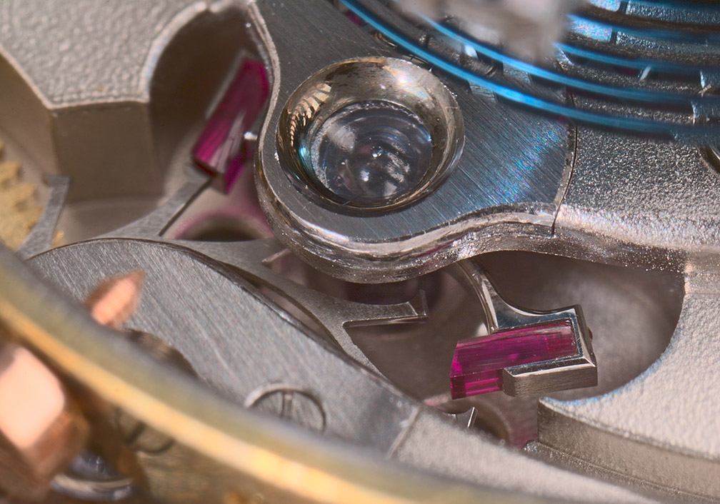 Brushed steel cap for the clear pallet jewel, fantastic sculpture of the polished and brushed anchor, delicate escape wheel: